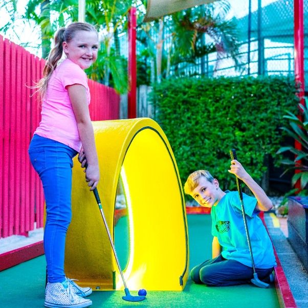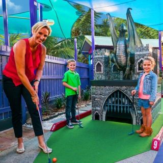 An explosion of colour, whimsical characters and tricky motorised obstacles - That's just the beginning! Fight off a medieval dragon, whiz around our loop de loop and visit a castle worthy of a fairy tale ending (your hole in one!). Time your putt to perfection at the spinning windmill, pass through pirate’s treasure and a not too spooky haunted house. Play rain or shine with all 18 holes covered by waterproof shade sails.